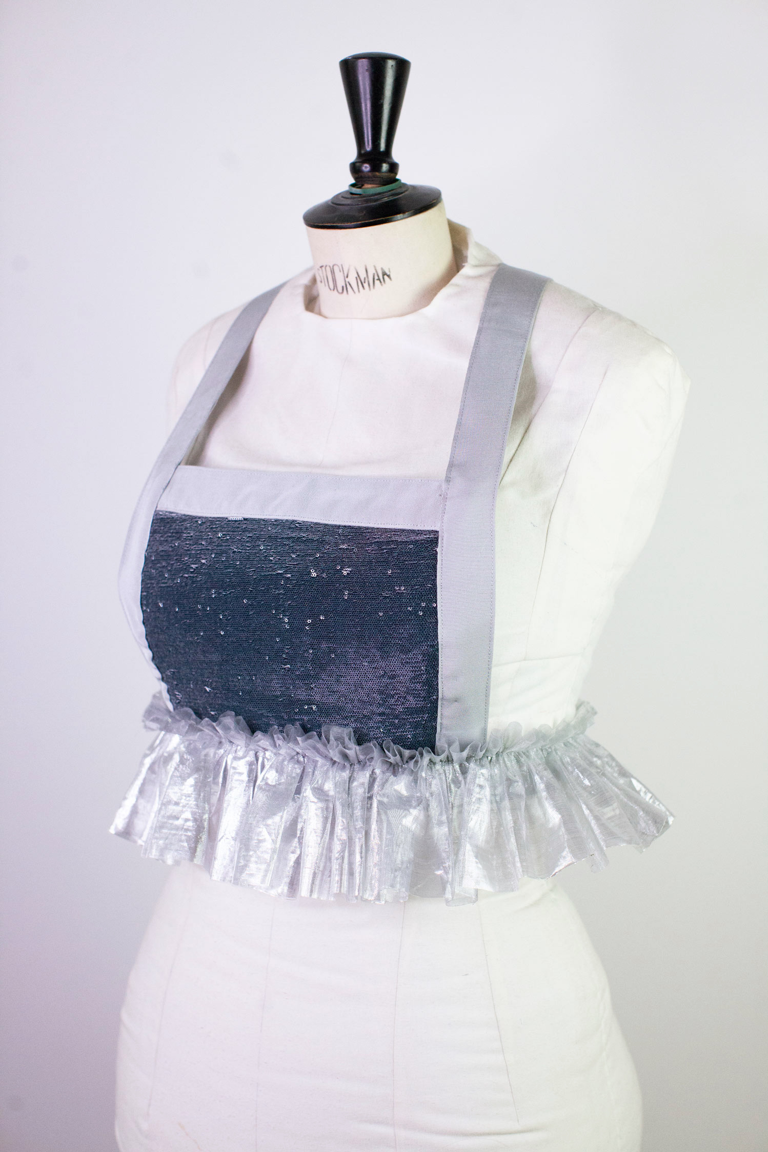 Top à plastron en paillettes bleu marine, bordé de gris et d’un volant froncé argenté. Inscrivez votre message en retournant les paillettes en blanc !