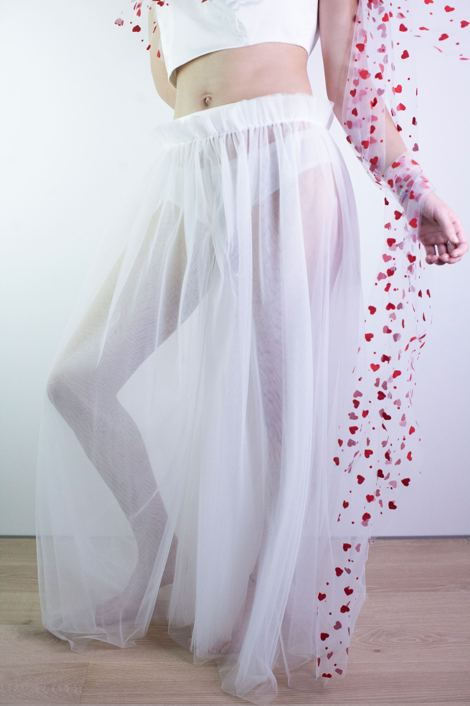 Jupe longue blanche en tulle avec deux poches coeurs zéro-déchet