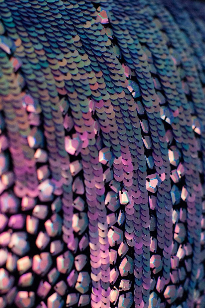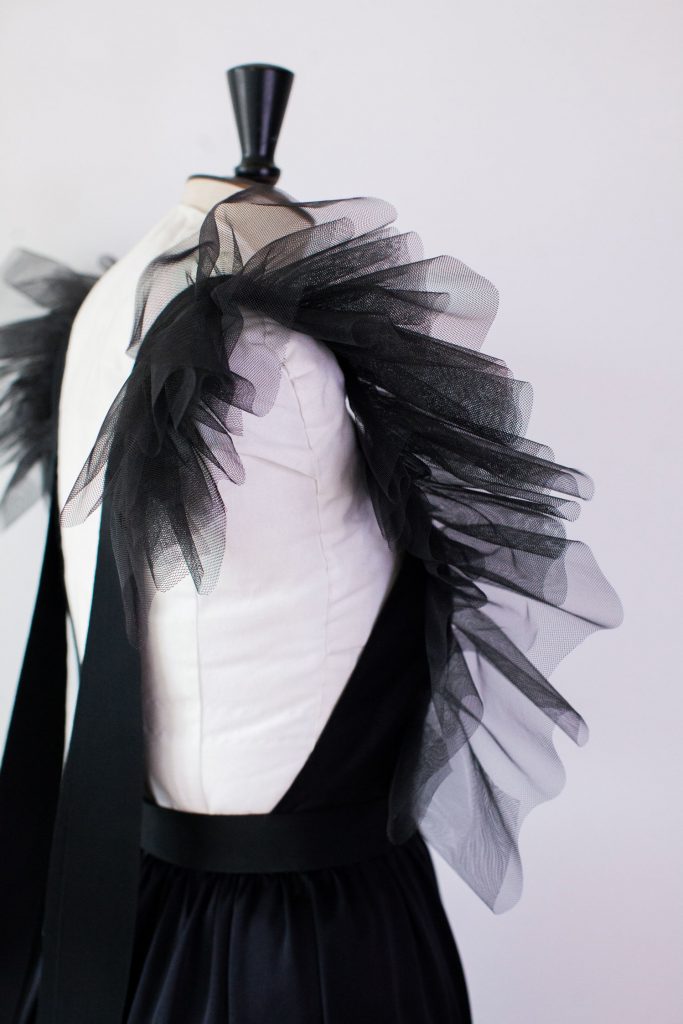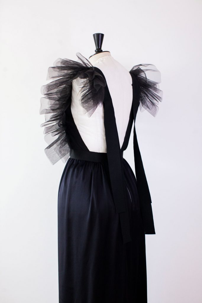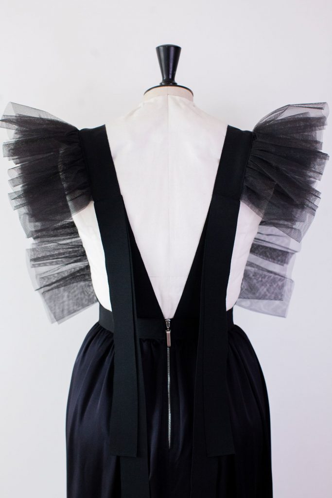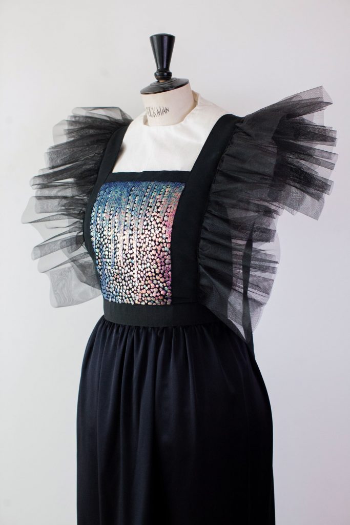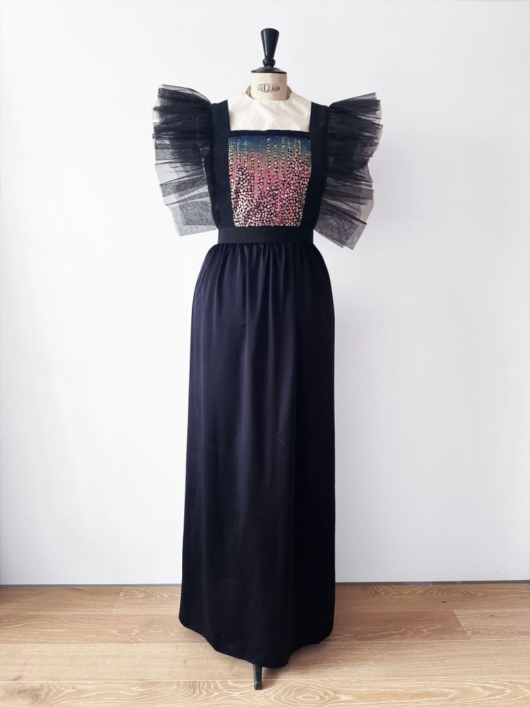 Robe longue noire à plastron brodé de paillettes iridescentes « scarabée » passant du vert bleuté au violet, bordé d’un ruban de grosgrain et agrémentée de volants de tulles froncés assortis. Sa partie jupe est en satin de soie noir. Un zip en métal la ferme délicatement sur le dos, laissant les rubans libres de s’envoler.