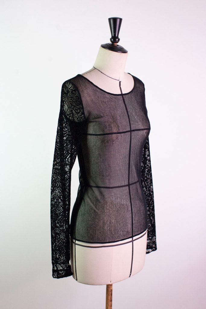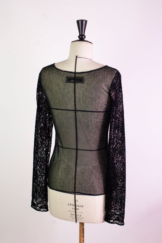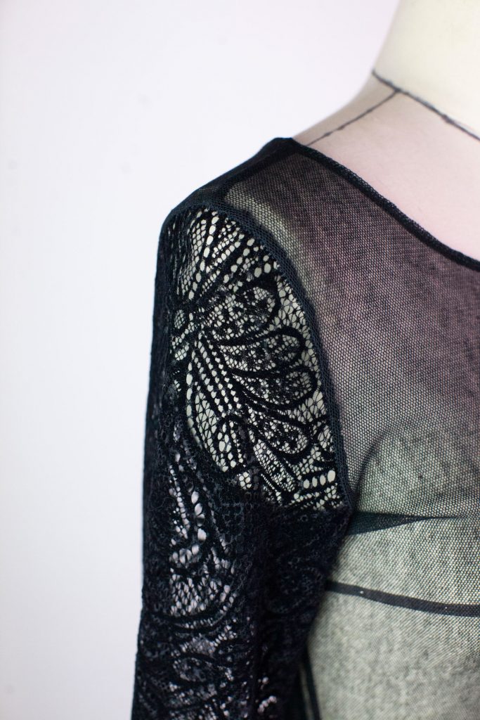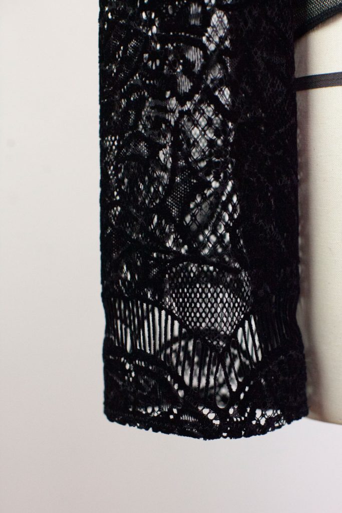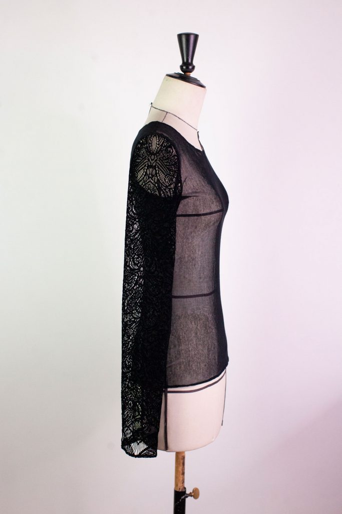 Top noir stretch en résille, à manches longues en dentelle floquée effet velours.