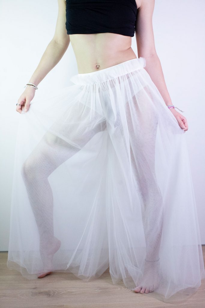 Éros est un pantalon blanc large en tulle avec une ceinture taille basse en satin, refermée délicatement dans le dos par un zip, qui s’assortit d’un top asymétrique en coton blanc, orné d’une bande froncée de tulle blanc floqué de cœurs rouges.