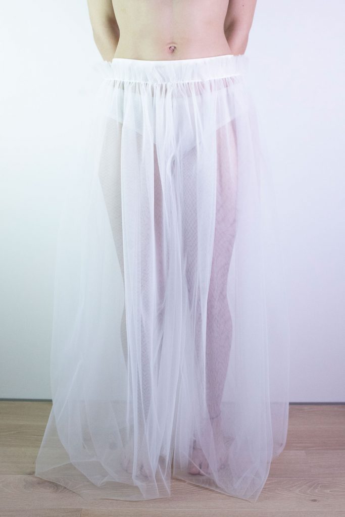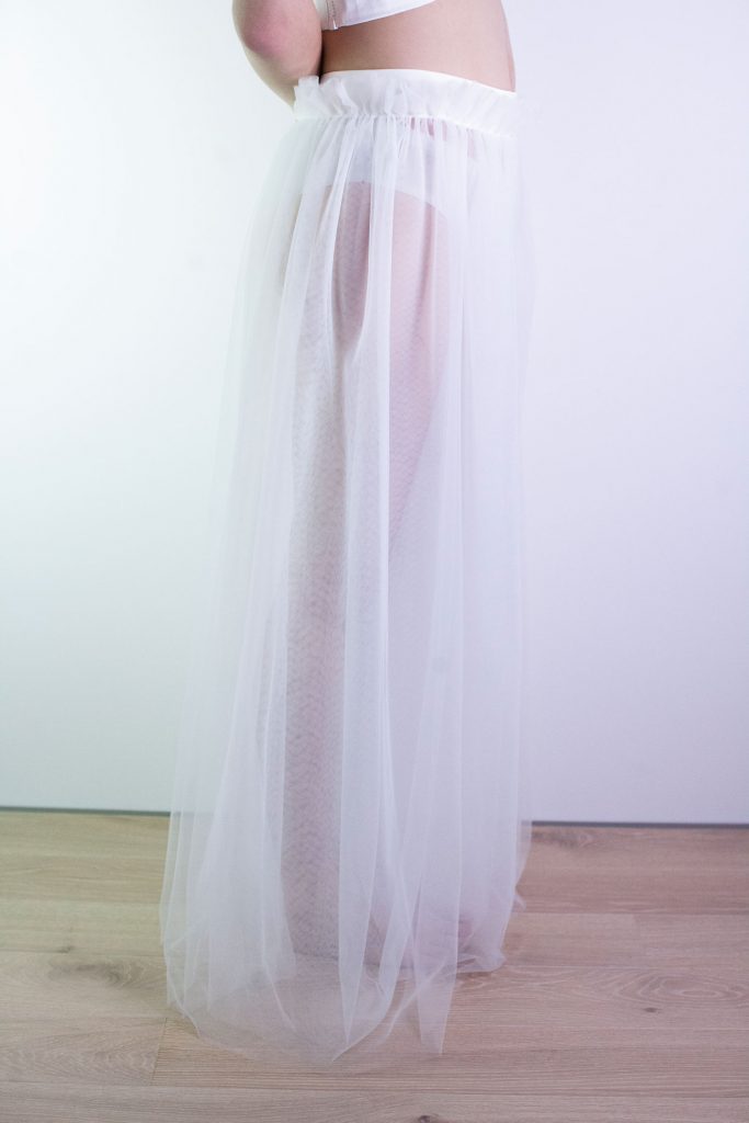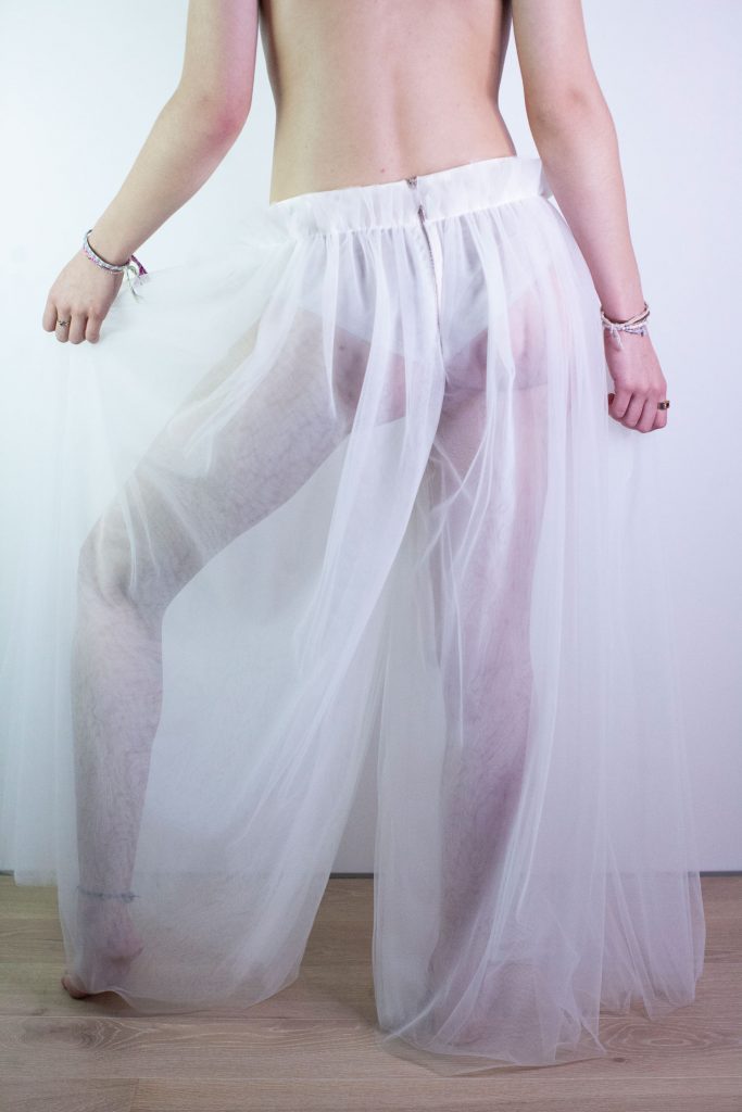 Éros est une pièce unique, conçue et cousue par Moïra, Juliette et Eva à Paris. L’intégralité de ses matières est issue de revalorisation textile et en particulier de la réutilisation de stocks délaissés de maisons de couture prestigieuses. Le tulle provient de l’excédent de tissu d’une robe de mariée !