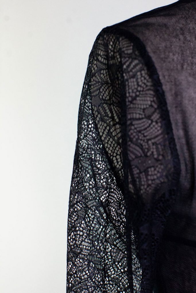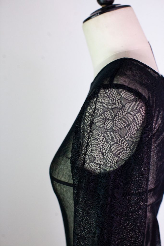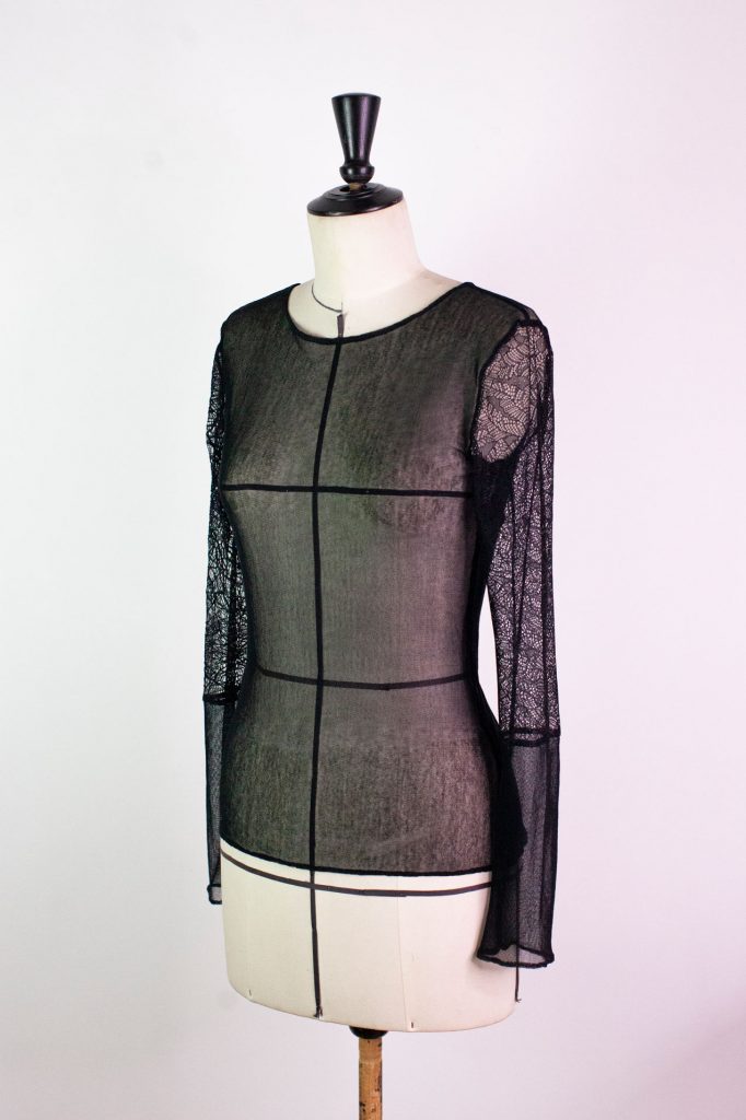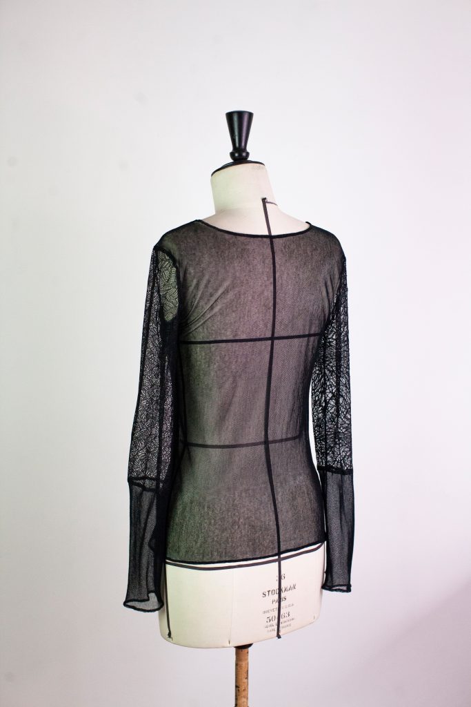 Top noir stretch en résille, à manches longues bi-matière en dentelle et résille.
